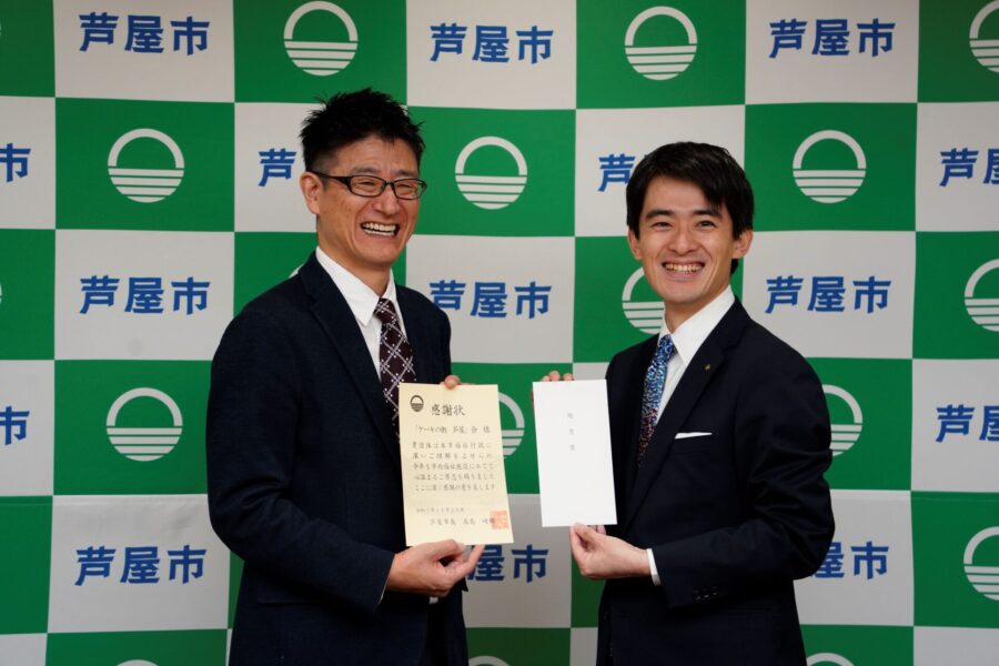 ▲(写真左から)髙島崚輔芦屋市長、藤原美規様、河野雅弘様、蟻田剛毅