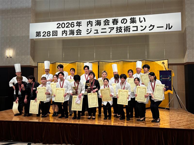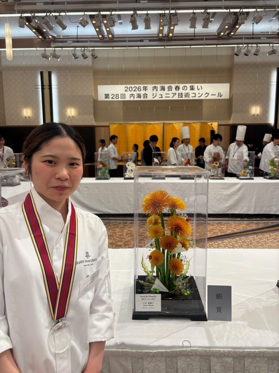 このたび、「菓子研究部」の部員1名が、2026年4月6日(月)にグランドプリンスホテル高輪にて開催された洋菓子コンテスト「第28回 内海会ジュニア技術コンクール」に出場し、アメ主体のピエスモンテ部門において、小寺 美菜子が銀賞を受賞いたしました。