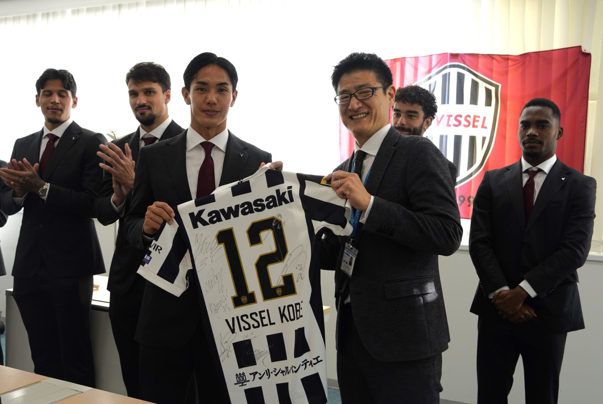 当社がスポンサーを務めるサッカーJ1「ヴィッセル神戸」の選手7名が、シーズン終了の挨拶のためご来社されました